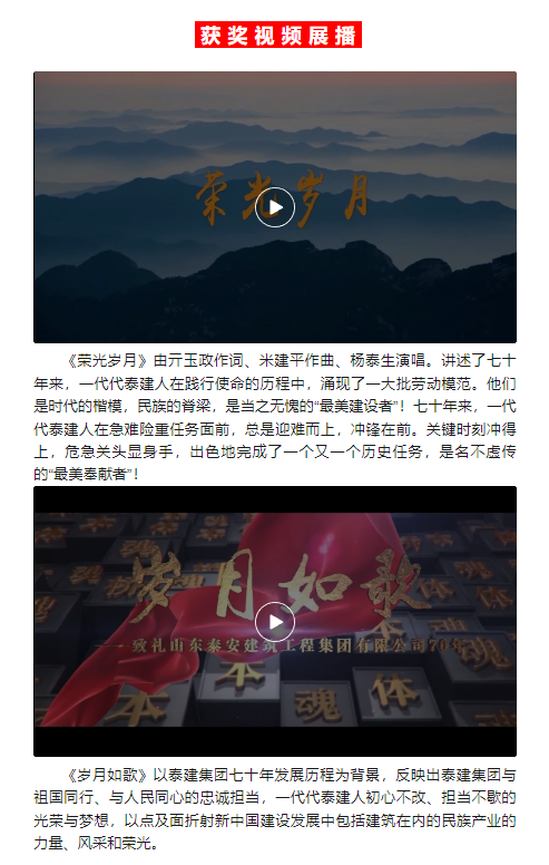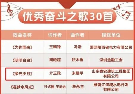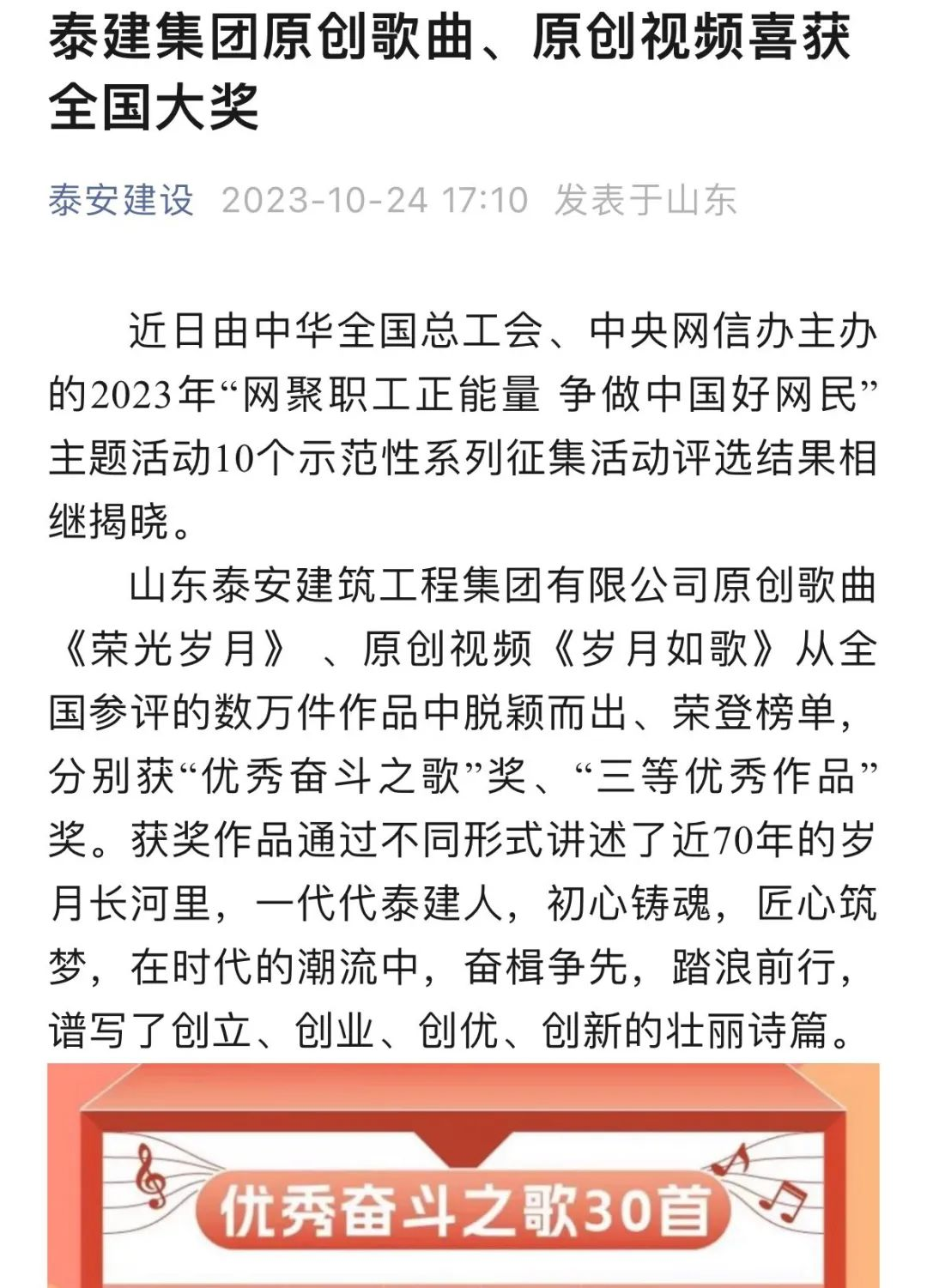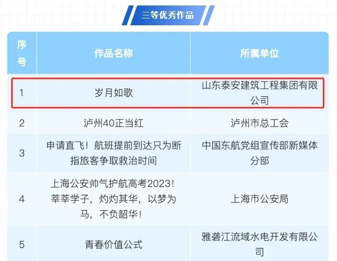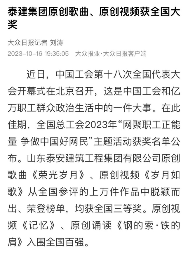 近日,中國工會第十八次全國代表大會開幕式在北京召開,這是中國工會和億萬職工群眾政治生活中的一件大事。在此佳期,全國總工會2023年“網(wǎng)聚職工正能量 爭做中國好網(wǎng)民”主題活動10個示范性系列獲獎榜單相繼揭曉。經(jīng)過初次篩選、網(wǎng)絡(luò)投票、專家評審等環(huán)節(jié),山東泰安建筑工程集團(tuán)有限公司原創(chuàng)歌曲作品《榮光歲月》、原創(chuàng)視頻作品《歲月如歌》從全國參評的數(shù)萬件作品中脫穎而出、榮登榜單,分別獲“優(yōu)秀奮斗之歌”獎、“三等優(yōu)秀作品”獎。原創(chuàng)視頻作品《記憶》、原創(chuàng)誦讀作品《鋼的索·鐵的肩》入圍全國百強(qiáng)。